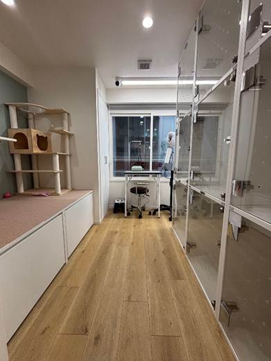 ケージの中だけでなく、滞在中のQOL(生活の質)を高めるための工夫を凝らしました。
